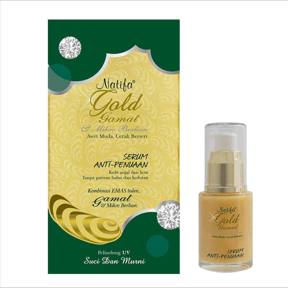 Natifa Gold Gamat & Mikro Berlian Serum Anti-Penuaan dengan formulasi khas menyerap pantas membantu mengurangkan kedutan pada kulit wajah. Melindungi kulit daripada tanda-tanda penuaan, melembap, menyubur dan mengembalikan keanjalan dan keserian kulit.